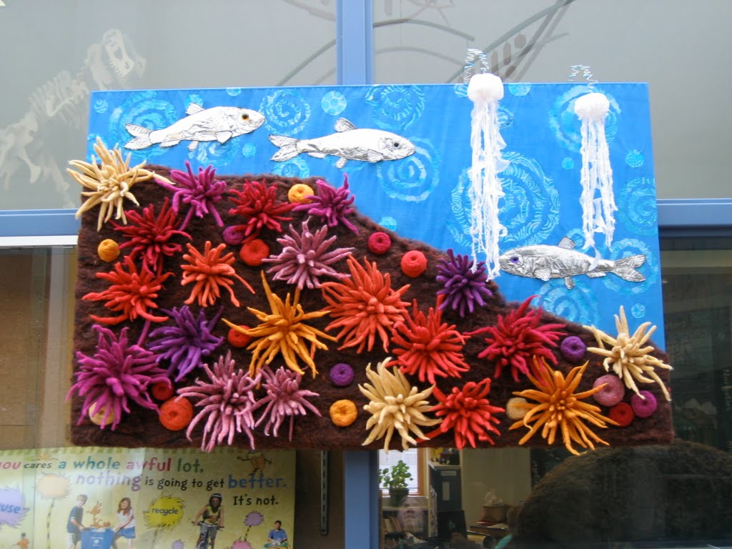I've recently completed work with Kindergarden and 1st grade students at North Star Elementary. We kicked off the 2010 Artist in Residence program learning about sea urchins and starfish. Students worked with air dry clay, paint, modge podge, tooth picks and beads to create three dimensional representations of these creatures.